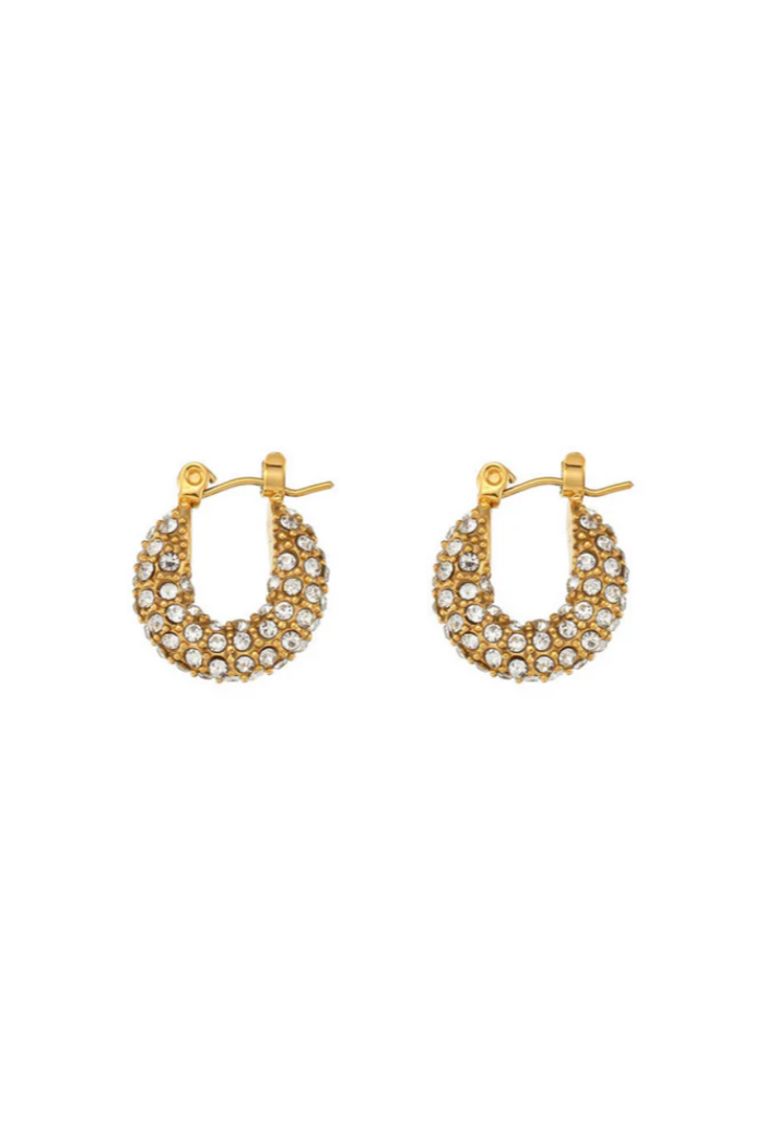 The Cara Huggie Hoops Small from Hjane Jewels bring effortless sparkle to your everyday look. Designed with a thick, rounded silhouette, these petite huggie hoops are fully encrusted with shimmering cubic zirconia stones for a radiant pavé finish that catches the light from every angle. Crafted in 18k gold plating over stainless steel, they offer lasting shine with a comfortable snap-post closure, perfect for all-day, everyday wear. Subtle yet striking, Cara is your go-to hoop for polished, modern elegance.