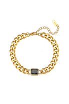 Bold with a refined edge, the Catherine Bracelet Black from Hjane Jewels is designed to make a statement. Featuring a chunky Cuban link chain in radiant 18k gold plating, this bracelet is elevated by a striking rectangular black stone at its center, creating a sleek contrast that feels both modern and timeless. Crafted from durable alloy or stainless steel, it offers long-lasting shine and everyday wearability. Finished with a secure lobster clasp and adjustable extender chain, the Catherine Bracelet delivers a confident, polished look, perfect for elevating both casual outfits and evening ensembles.