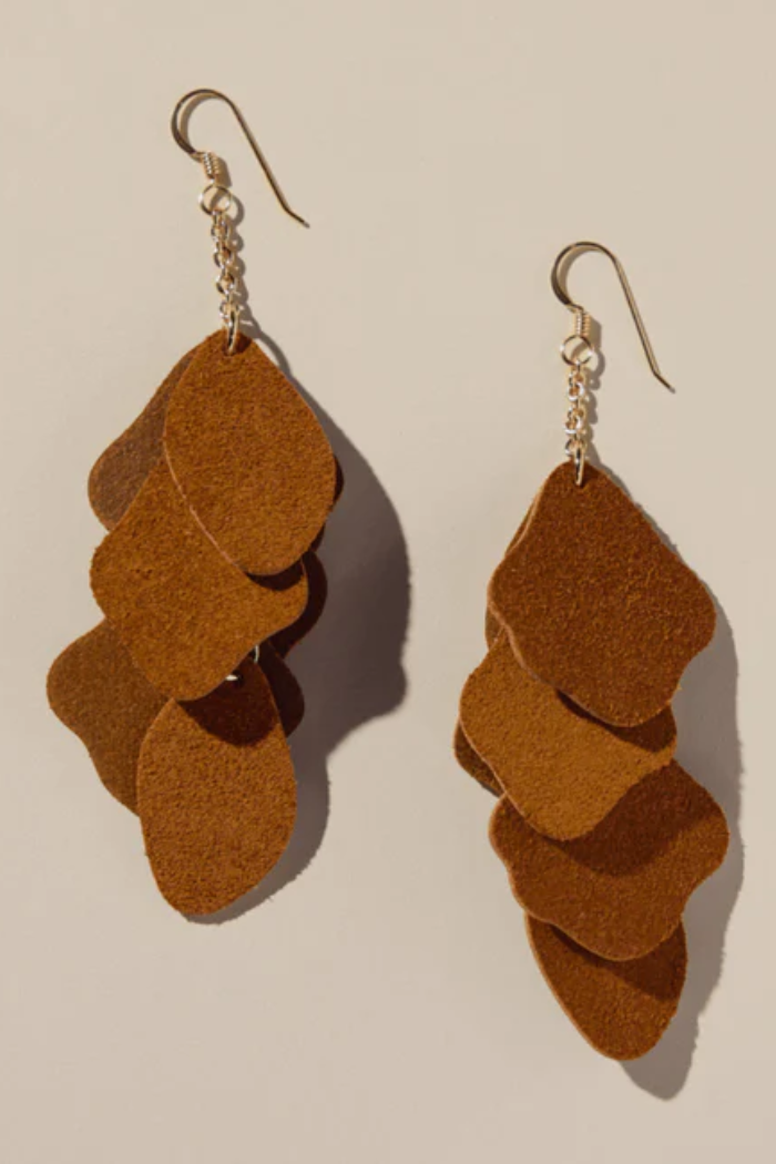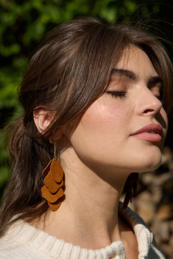 This layered statement earring is designed to be incredibly soft with lots of volume and a subtle sway. Crafted with soft, Chestnut-toned premium nappa suede attached to gold or silver chain components, the versatile Florence earrings will take your look up a notch.