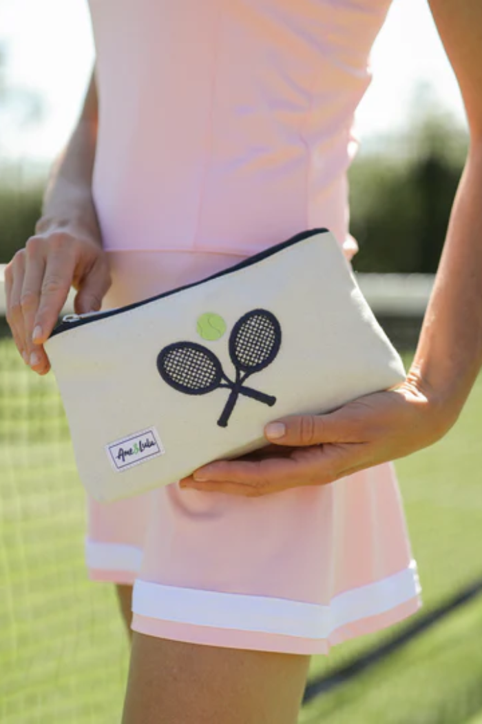 A compact cosmetic pouch designed with playful tennis-racket embroidery and a zipper top for easy access. The Classic Racquets Cosmetic Case holds makeup and small essentials in a structured, canvas construction. Blue Gardenia lends a sporty, preppy touch with embroidered details and a neutral palette that suits everyday use. Tuck it into a tote or carry it on its own for off-duty errands or court-side style.