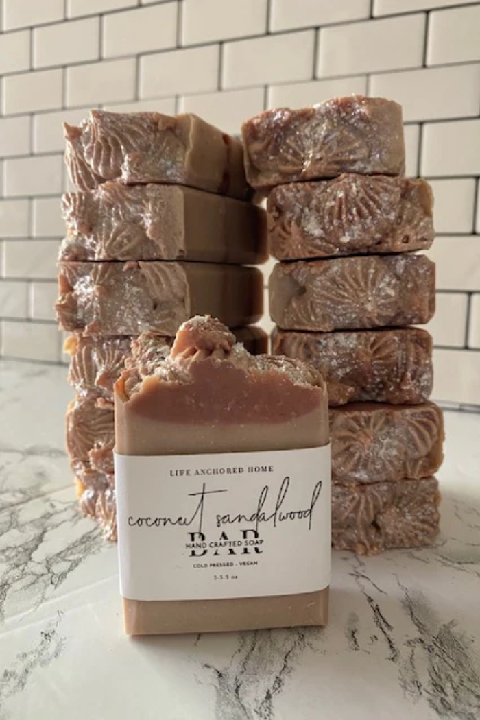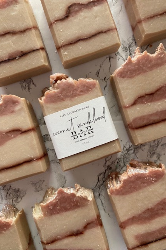 Handcrafted bar soap scented with coconut and warm sandalwood for a subtly tropical, earthy bath experience. The Coconut Sandalwood Soap is made by Life Anchored Home and features layered creams and blush tones with a lightly textured top. Ideal as a guest soap or a thoughtful gift, it offers gentle cleansing and a comforting, long-lasting fragrance.