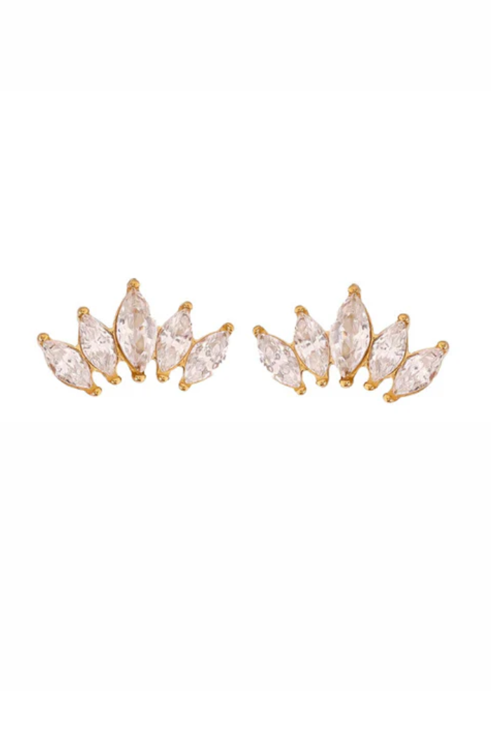 Elevate your everyday elegance with these 18k gold-plated Crystal Studs. Each earring features a radiant, crown-inspired cluster of five marquise-cut stones, carefully set to catch the light from every angle. Sleek and sophisticated, these studs bring a modern sparkle that transitions effortlessly from day to night, making them perfect for both special occasions and refined daily wear.