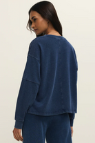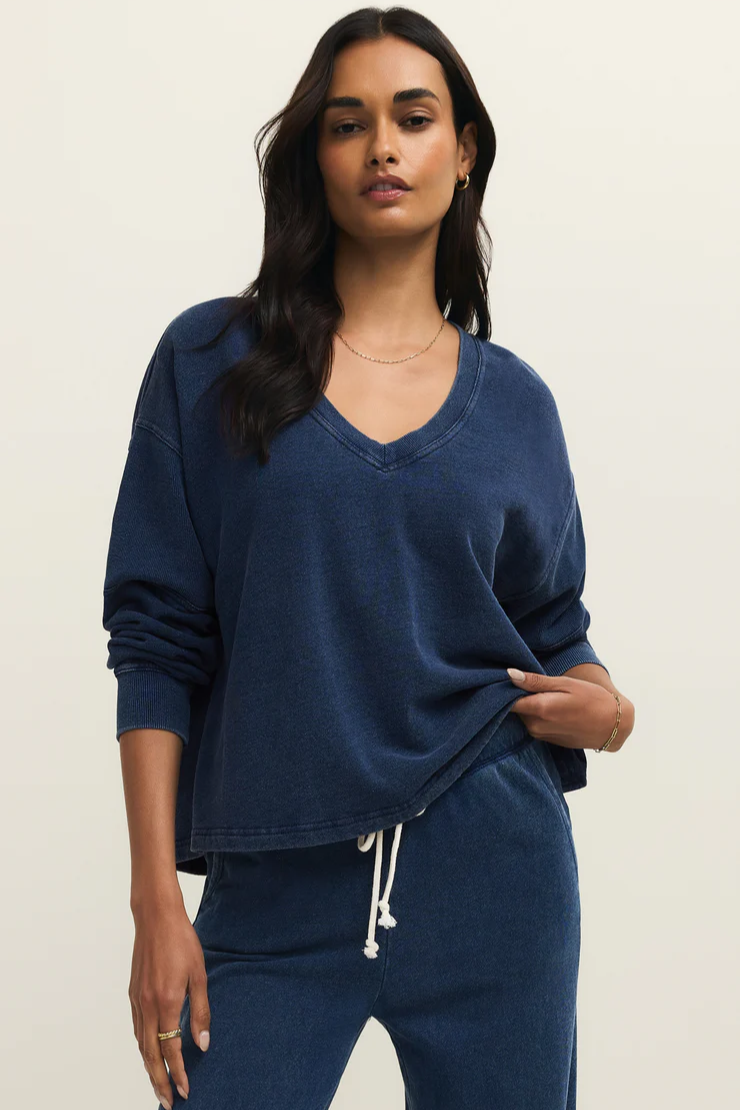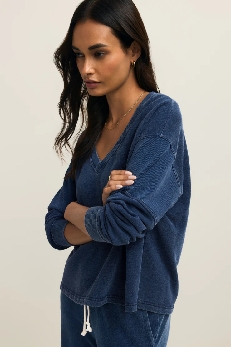 Soft knit denim gives this v-neck sweatshirt its laid-back edge. The mineral wash adds a perfectly lived-in look that only gets better with wear. With subtle rib details and an easy fit, it’s a relaxed essential that pairs with everything.