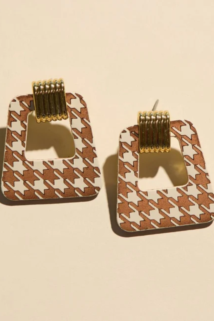 Timeless style meets a modern silhouette with the Avery earrings. This lightweight statement earring is created with our premium firm Ecru leather with a bronze embossed houndstooth print and a beveled gold or silver stud component.