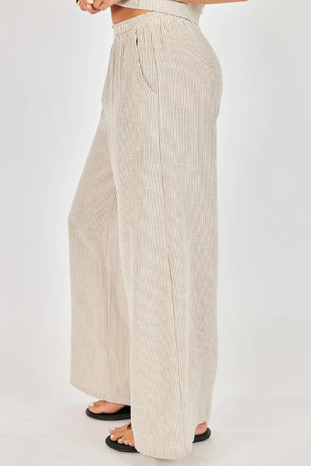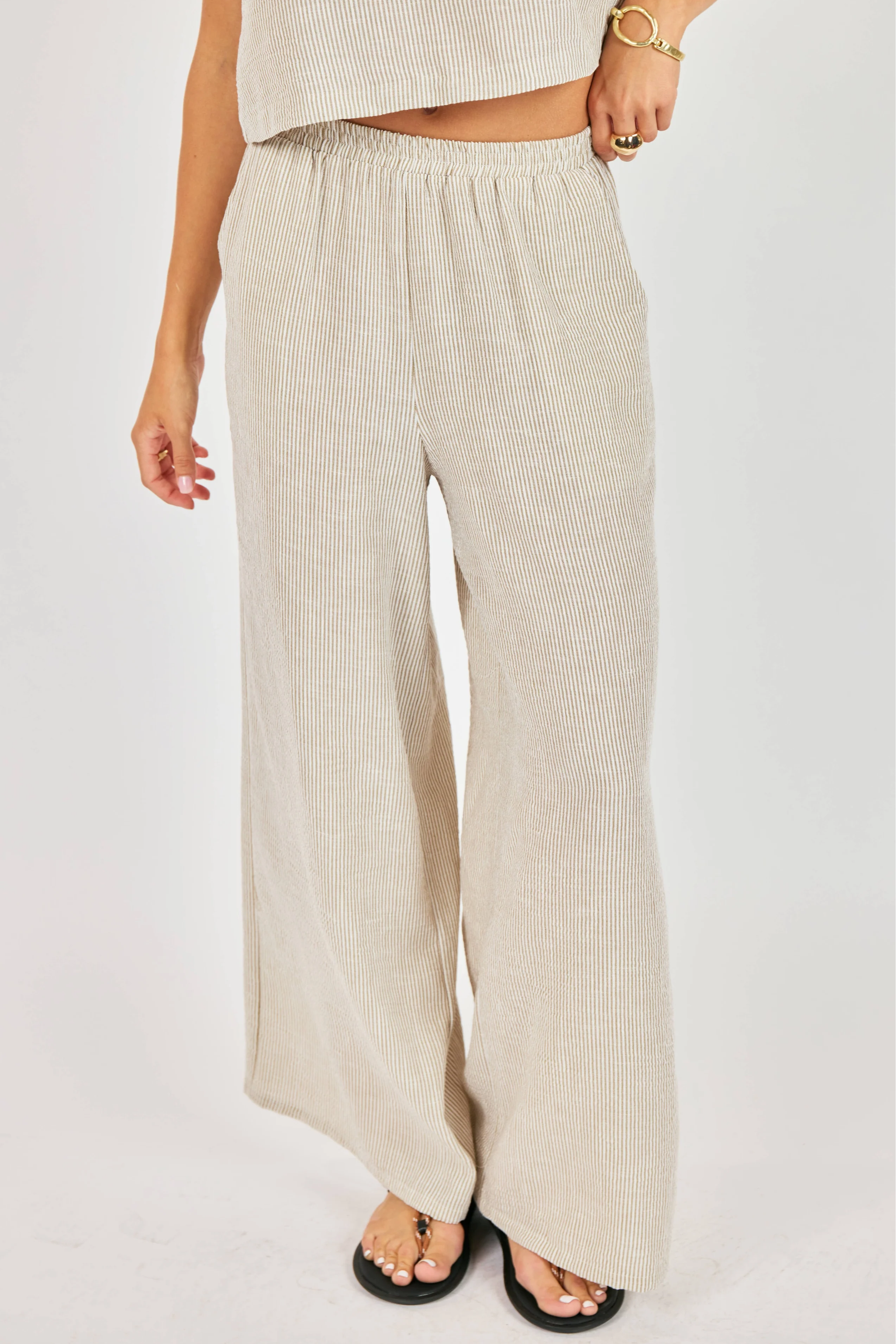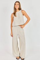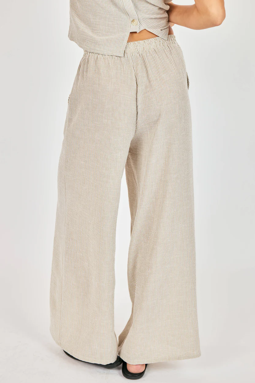 Easy, breezy, and made for sunshine, the Garden Sun Pants from Sadie and Sage bring effortless style to your warm-weather wardrobe. Designed with a relaxed wide-leg silhouette, these pants feature a subtle textured stripe, an elastic waistband, and flowy full-length legs that move beautifully with every step. Crafted from lightweight woven fabric, they’re the perfect go-to for casual days, beach outings, or vacation escapes.