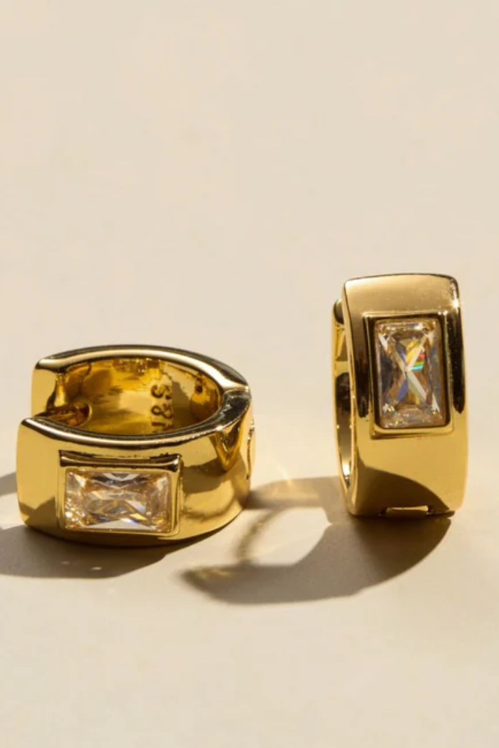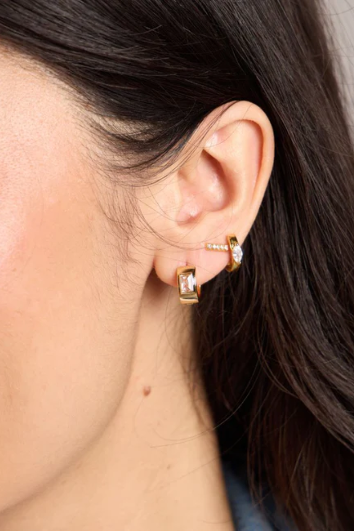 These rhodium-plated baguette bezel huggies feature vibrant baguette cut stone in a sleek bezel setting, perfect for everyday wear and effortless modern style. Wear them alone for a minimalist look or stack them for a stylish statement.