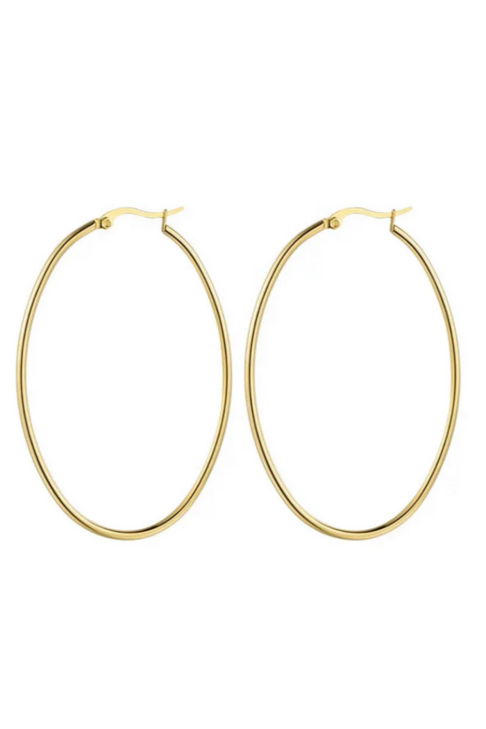 Crafted for everyday elegance, these hoops feature a secure hinged clicker closure for easy wear and a seamless fit. Whether styled with casual daytime looks or elevated evening outfits, the Gold Oval Hoops add a refined statement that feels both bold and endlessly versatile.