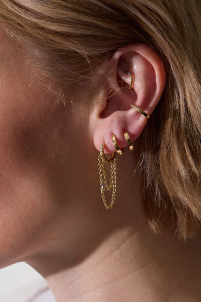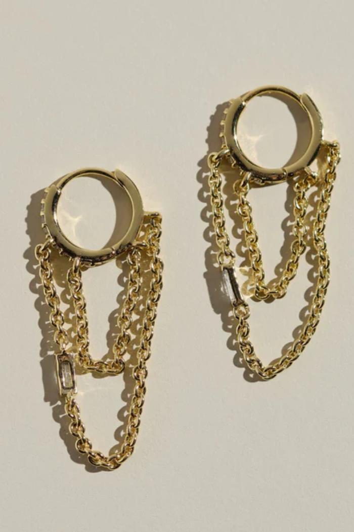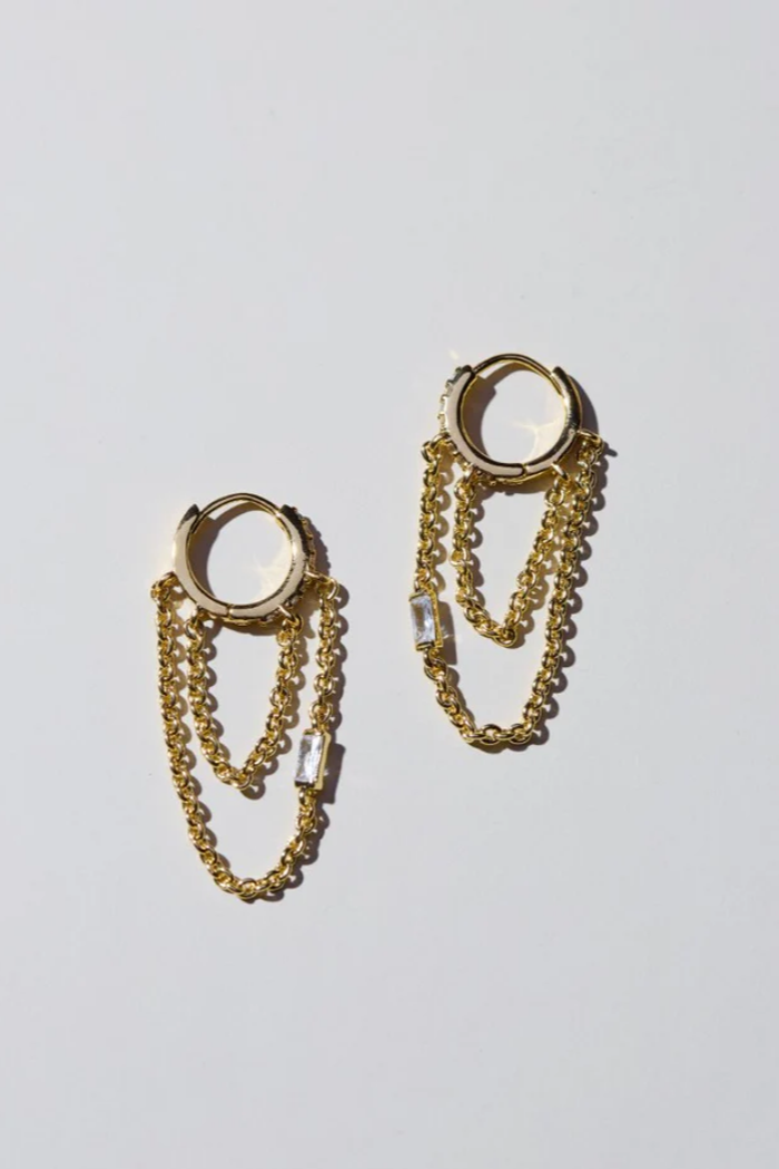 Amp up any ear stack with the Gold Thea Chain Huggies. Stack them to make a bold layered statement or keep it simple and create a unique edge. These huggies are crafted with 14k gold-plated hardware, looped chains and emerald cut glass stone accents. Let this timeless accessory speak volumes with your style.