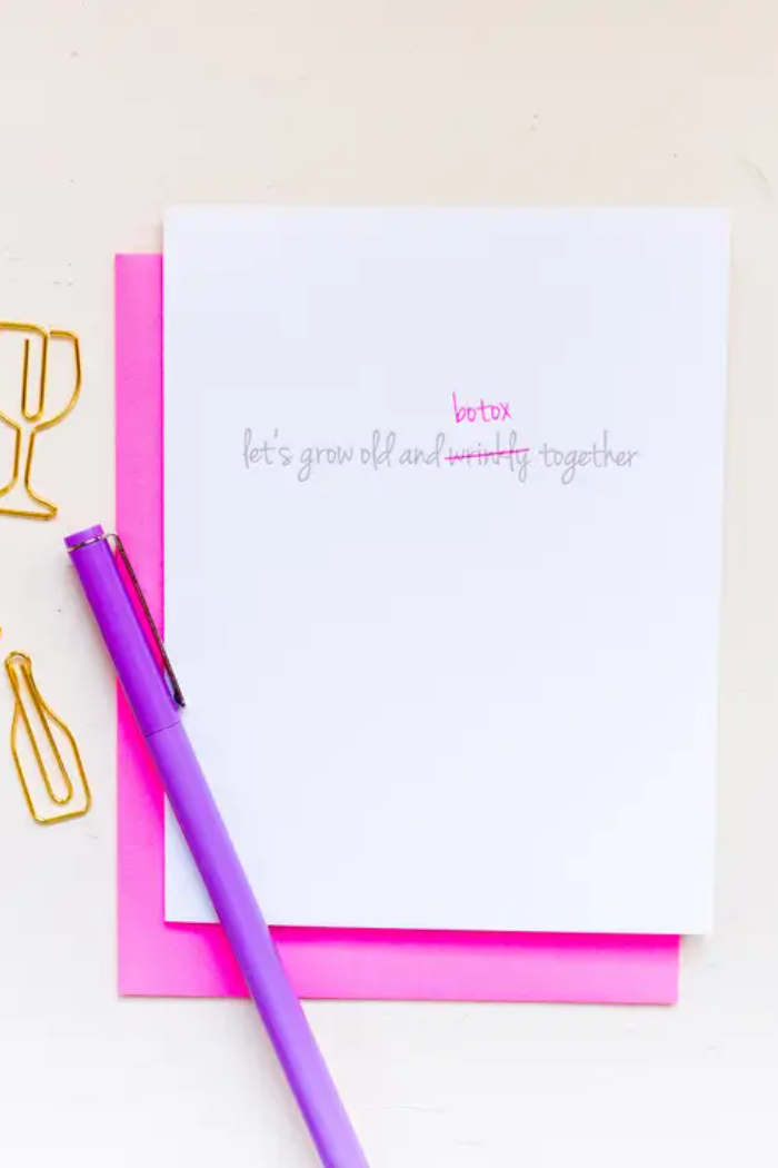 Aging may be inevitable, but at least we can laugh about it. Our “Let’s Grow Old & Botox Together” card is letterpress printed on luxe tree free paper, making it the perfect cheeky way to celebrate a birthday or toast to lifelong friendship.