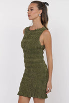 Turn heads in this luxe, figure-hugging mini dress. Made from rich avocado green velvet with an elegant smocked texture, it blends sophistication with modern edge. A chic, fashion-forward piece that’s perfect for any occasion.