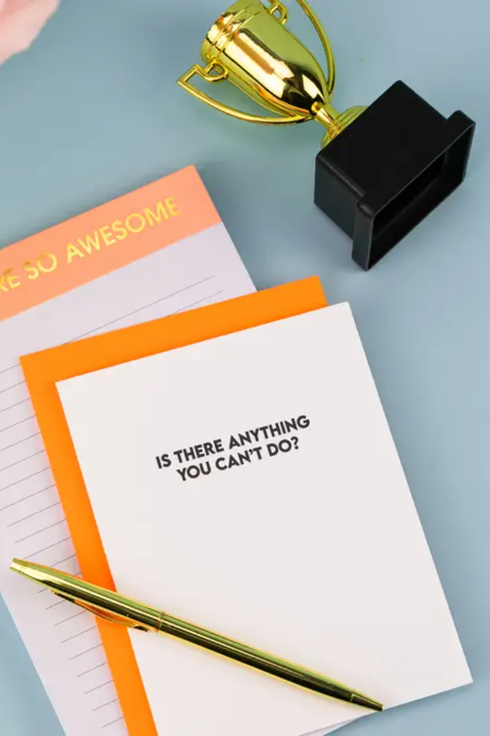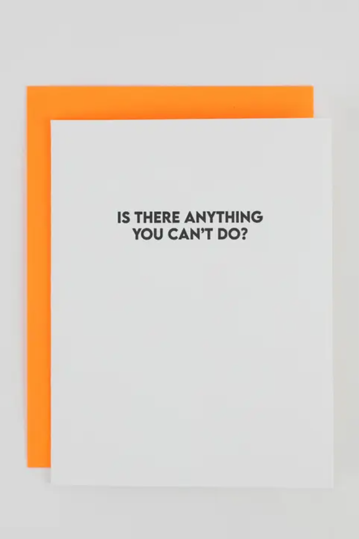 Our “Is There Anything You Can’t Do?” card is the ultimate hype-up moment - letterpress printed on a vintage printing press in sunny California. Featuring bold black ink on crisp white stock and paired with a vibrant neon orange envelope, this card is simple, punchy, and perfect for celebrating every overachiever, goal crusher, or certified badass in your life. Blank inside for writing the pep talk, praise, or proud-parent moment they deserve.