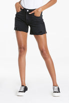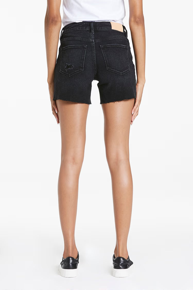 These mid rise fray hem shorts in black denim combine casual style with comfort and stretch.