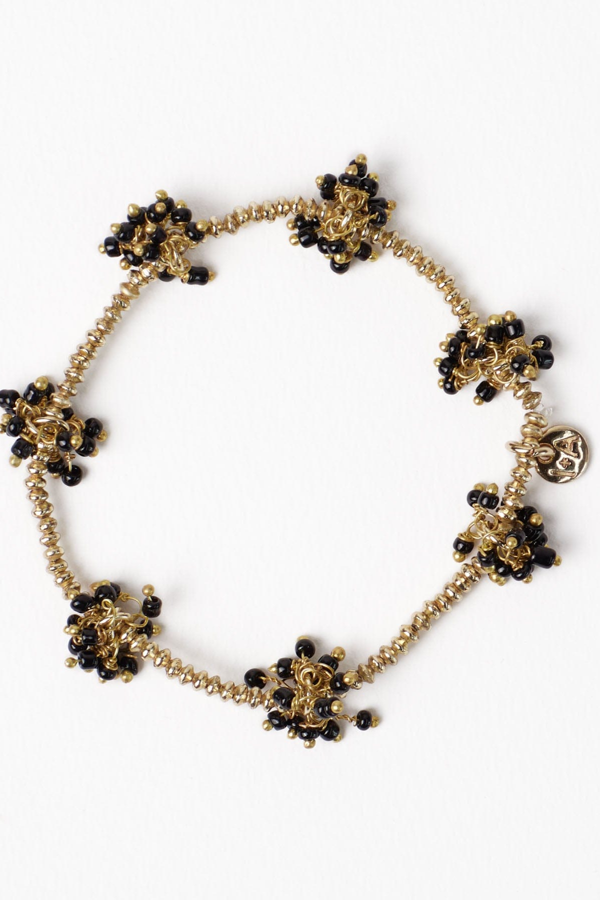 • Small brass beads paired with clustered black glass