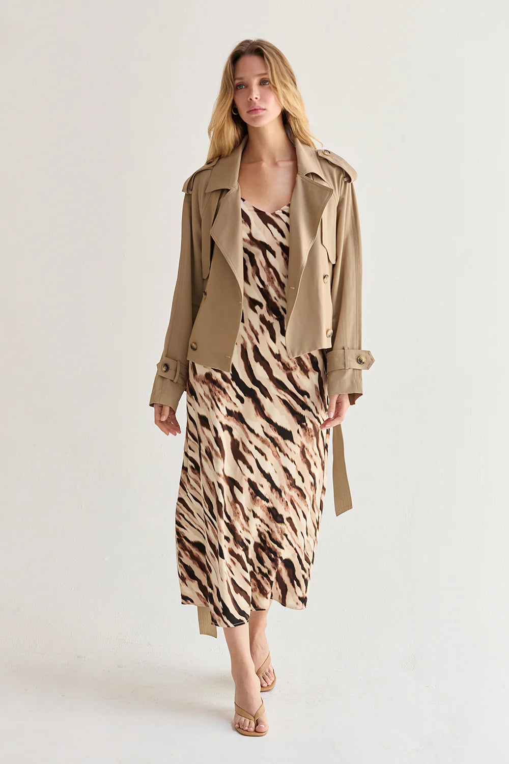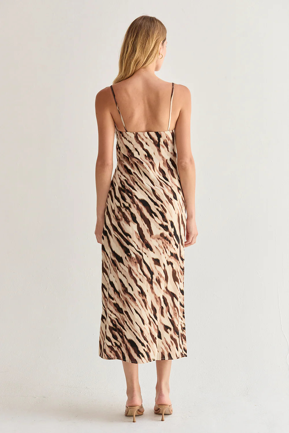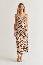 The Kira Abstract Animal Print Midi Slip Dress features delicate spaghetti straps and a flattering V-neckline with bust darts for subtle shaping. Designed in an allover abstract animal print, this easy slip-on style is finished with an invisible side zipper with hook-and-eye closure and full lining for a smooth, comfortable fit.