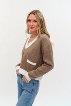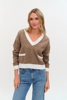 The Libby Sweater features a flattering v-neck and a stylish color block design that elevates your casual wardrobe. Combining comfort with a modern edge, this sweater is perfect for layering or wearing on its own to make a confident, chic statement.