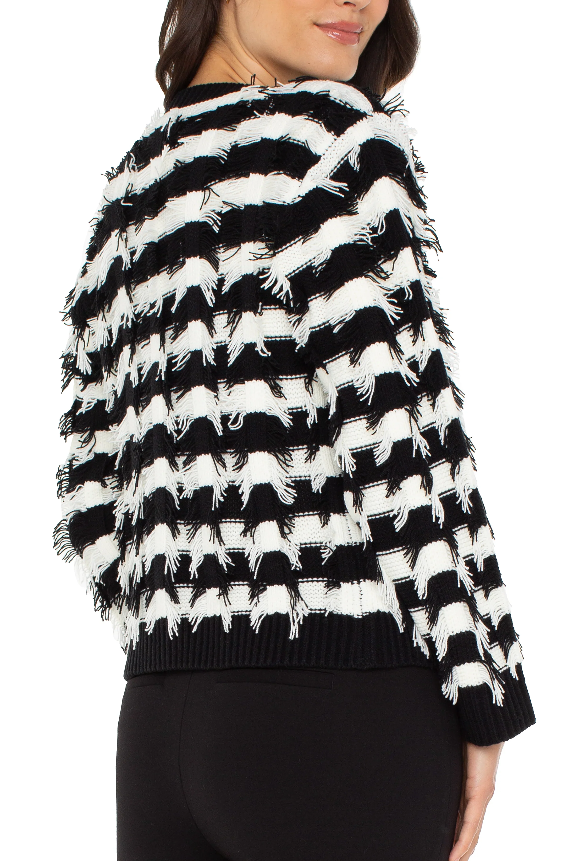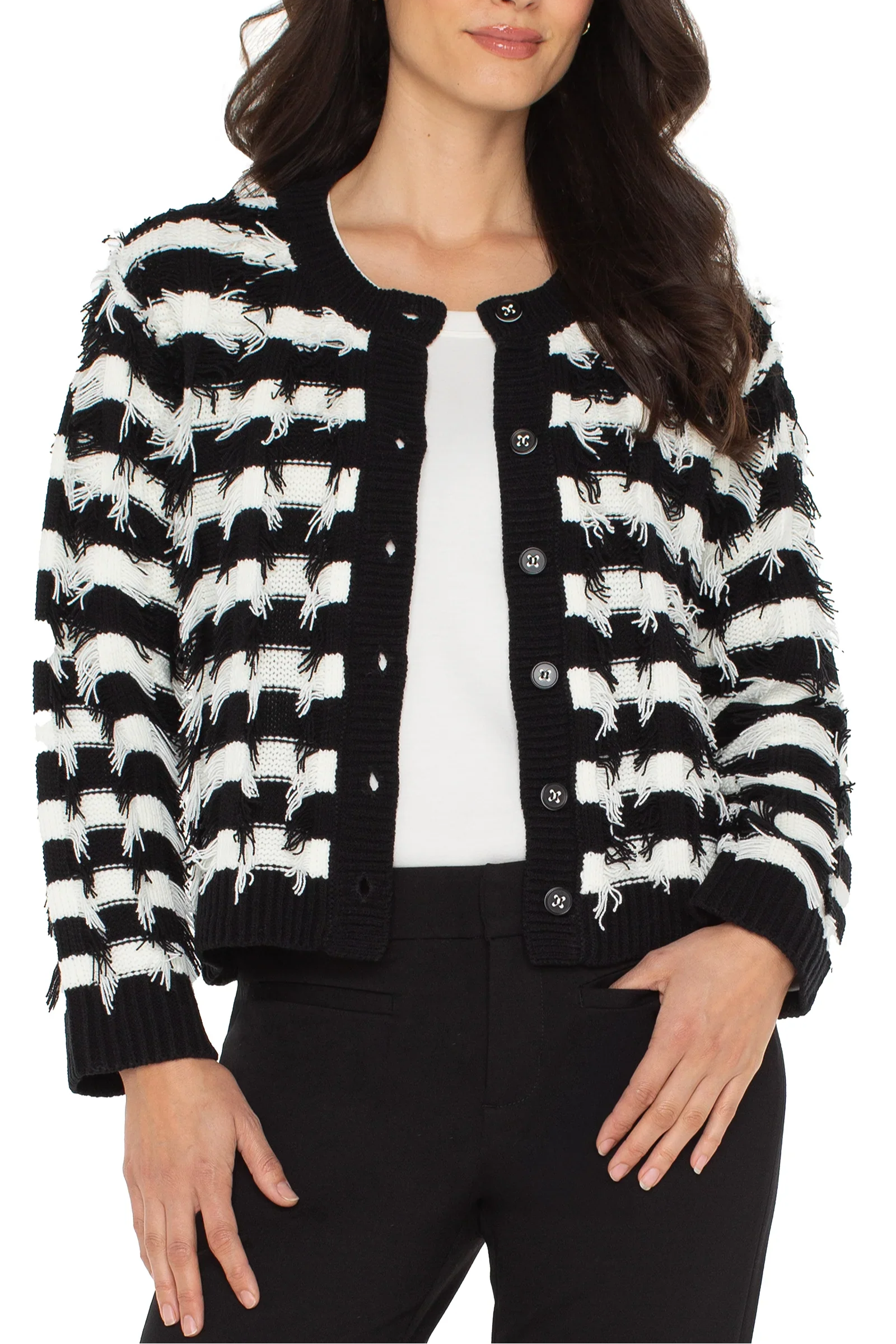 A fresh take on a classic cardigan. This textured knit features bold black-and-white stripes and playful fringe detailing that adds movement and personality. Finished with a crew neckline and button-front design, it’s the perfect balance of statement and ease.