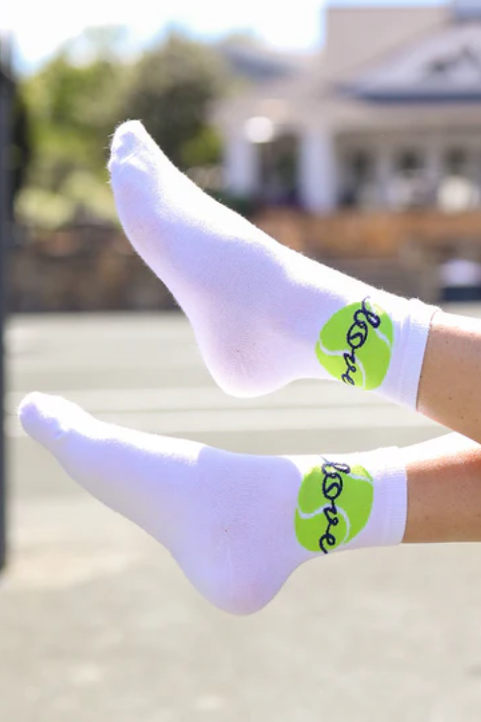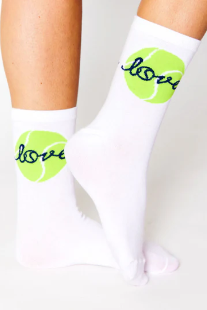 A sporty crew sock with a neon tennis-ball graphic and cursive "love" motif, perfect for casual court-side style. The Love Ace Crew Socks blend cotton stretch for a cushioned fit that sits at the lower calf. Designed by Blue Gardenia, they add a playful, athletic touch to everyday outfits or light tennis play.