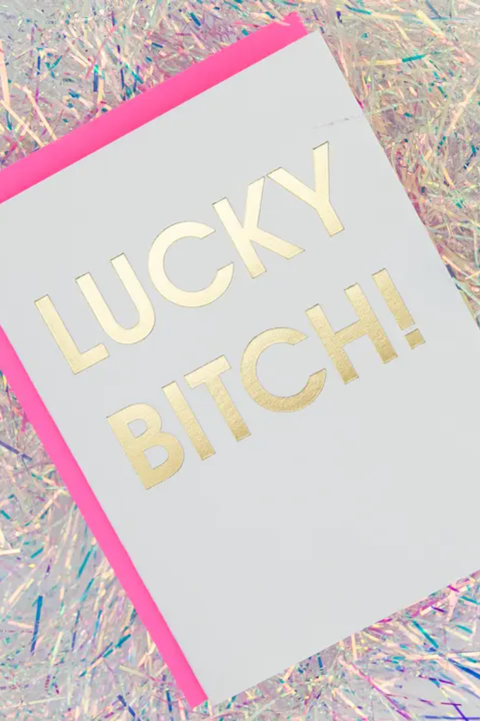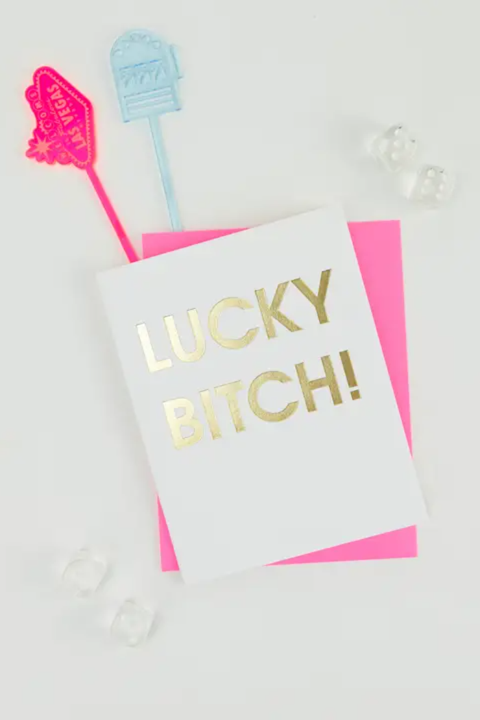 Our “Lucky Bitch” card is letterpress printed on a vintage printing press in sunny California. Featuring luxe gold foil on bright white paper and paired with a bold pulsar pink envelope, this card is the perfect way to celebrate wins, friendships, or just life’s lucky breaks.