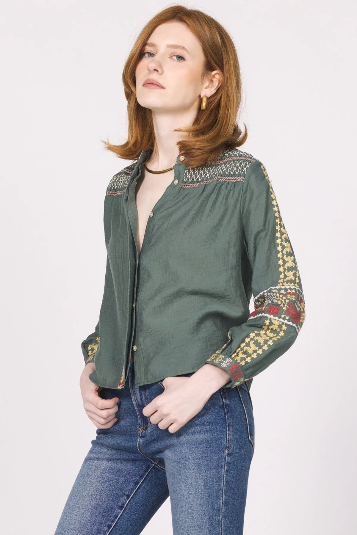 Makenna embroidered detail long sleeve shirt featuring a button-up front. Crafted in a charming seasonal hues, this versatile piece combines elegance with ease. Perfect for elevating any outfit, this relaxed fit offers both style and comfort for any occasion. A true must-have with intricate embroidery that adds a touch of sophistication.
