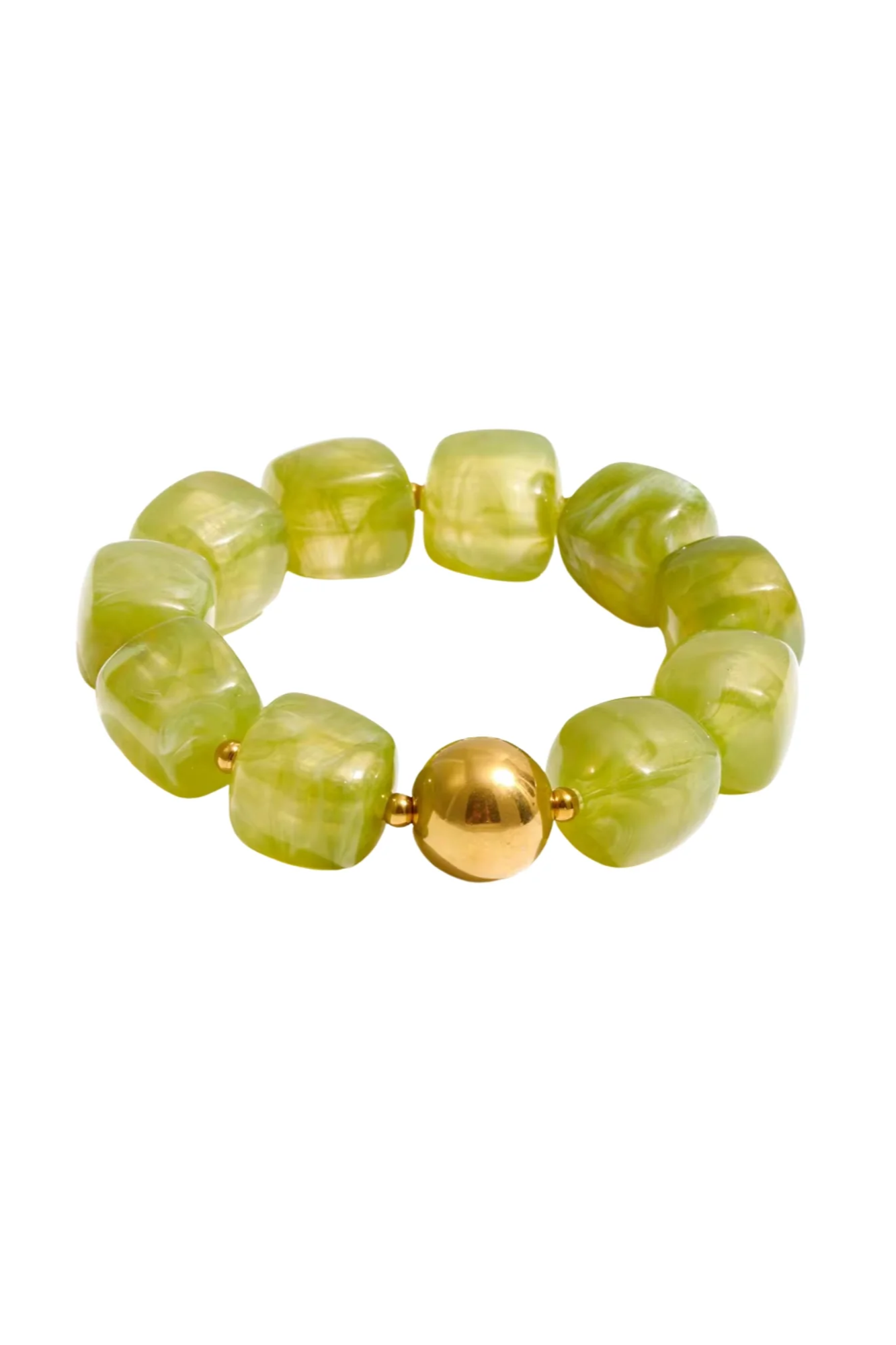 Add a fresh pop of color to your everyday look with the Martha Stretchy Bracelet in Green from Hjane Jewels. This statement piece features oversized, irregular oval beads in a beautiful marbled swirl of soft and vibrant green tones, accented with a single polished gold-tone sphere for a refined touch of shine and contrast.