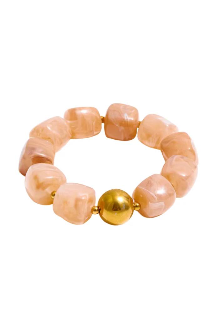 Add a soft, neutral accent to your style with the Martha Stretchy Bracelet in Tan from Hjane Jewels. This statement piece features oversized, irregular oval beads in a warm marbled swirl of tan and beige tones, accented with a single polished gold-tone sphere for a subtle touch of shine and elegance.