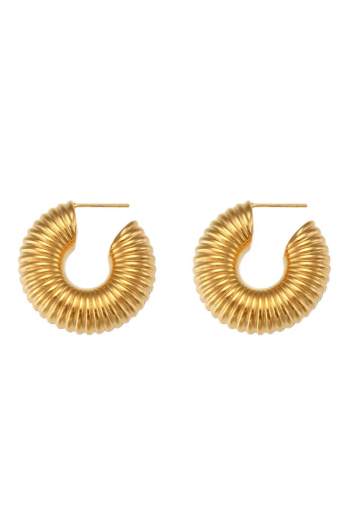 Bold and textured, the Mia Hoops feature a chunky ribbed design in lightweight, 18k gold-plated stainless steel. Hypoallergenic, tarnish- and water-resistant, they’re perfect for everyday wear. Secured with a classic post-back closure, these statement hoops elevate any outfit effortlessly.