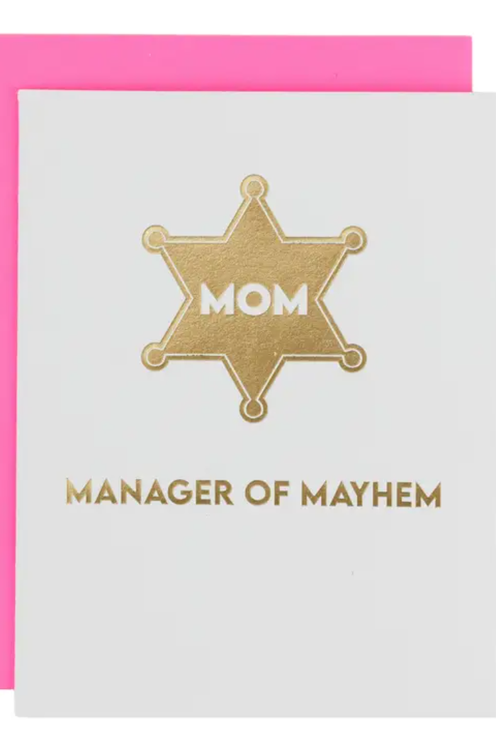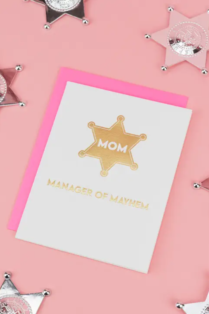 Celebrate the woman who’s kept the whole circus running with grace, grit, and a questionable amount of patience. Our “Manager of Mayhem” Mother’s Day card features bold gold foil and a sherbet-pink envelope - letterpress printed on a vintage press in California for a luxe, gift-worthy finish. A perfectly cheeky way to honor the mom who truly does it all.
