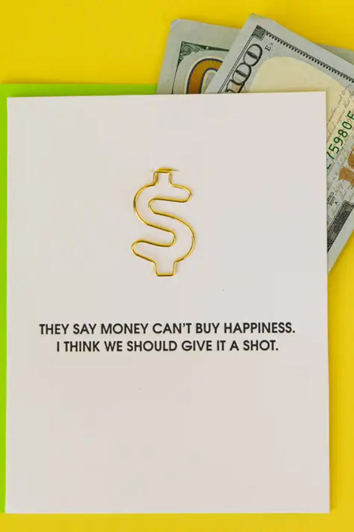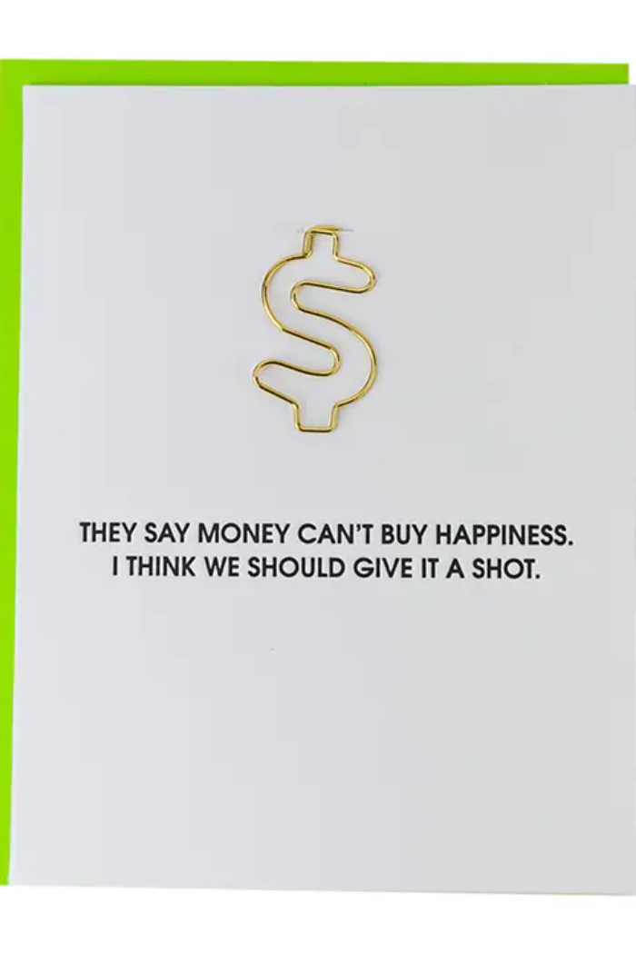 Our “They Say Money Can’t Buy Happiness, Let’s Give It A Shot” card is letterpress printed on a vintage printing press in sunny California. Paired with a bold green envelope, this cheeky design includes a reusable gold dollar sign paper clip—perfect for holding cash, a gift card, or saving as a keepsake.
