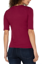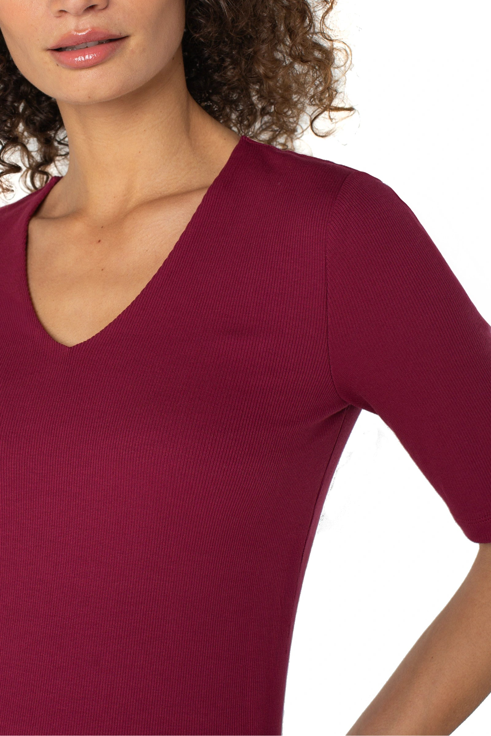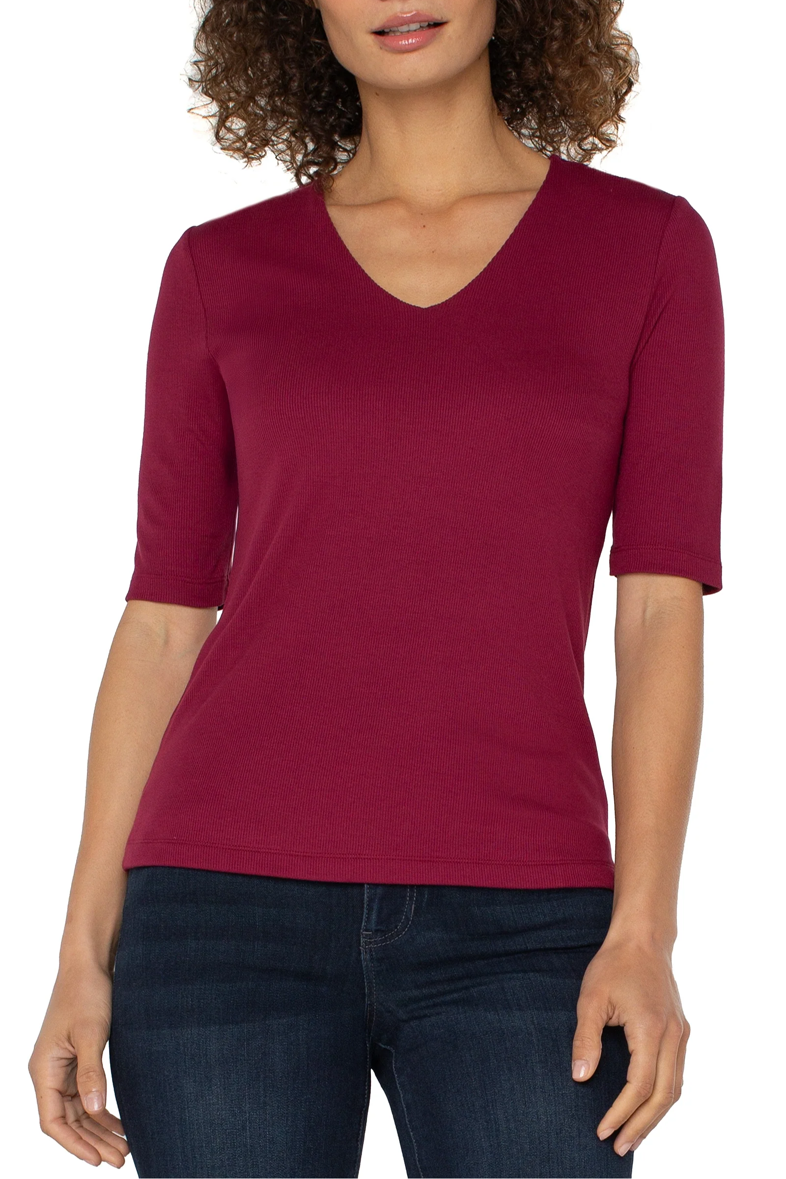 An effortlessly refined essential. This modern take on the classic V-neck is crafted from a soft, mini rib knit for a sleek, flattering fit. Designed with a front double layer for smooth, confident coverage, and finished with an elbow-grazing sleeve for a touch of sophistication. A versatile staple made to move from polished days to effortless evenings.