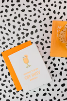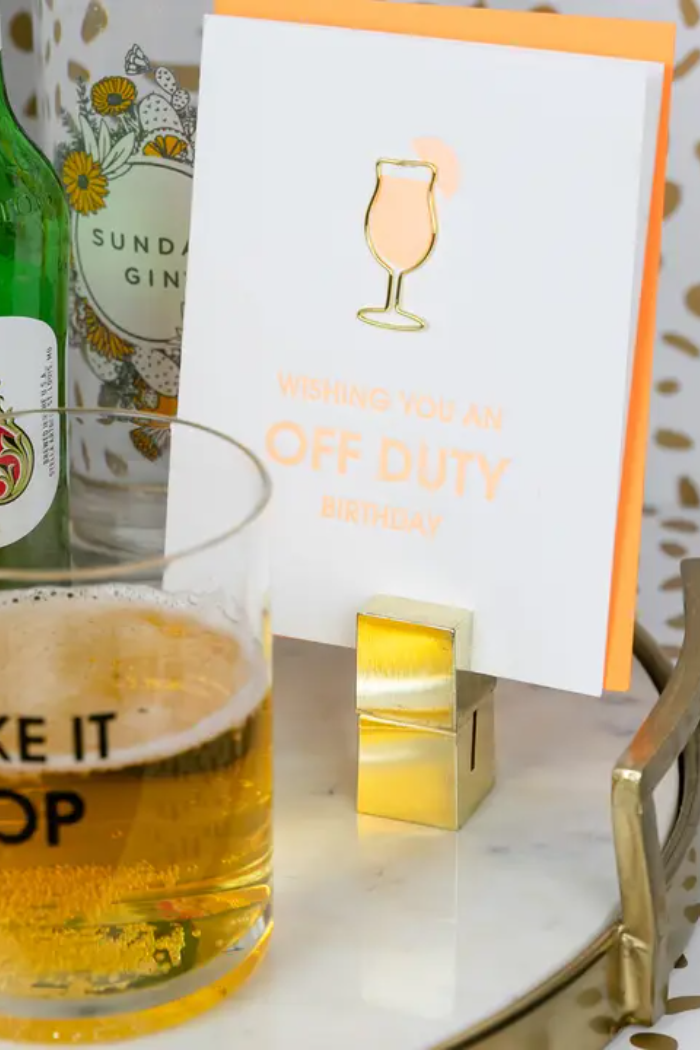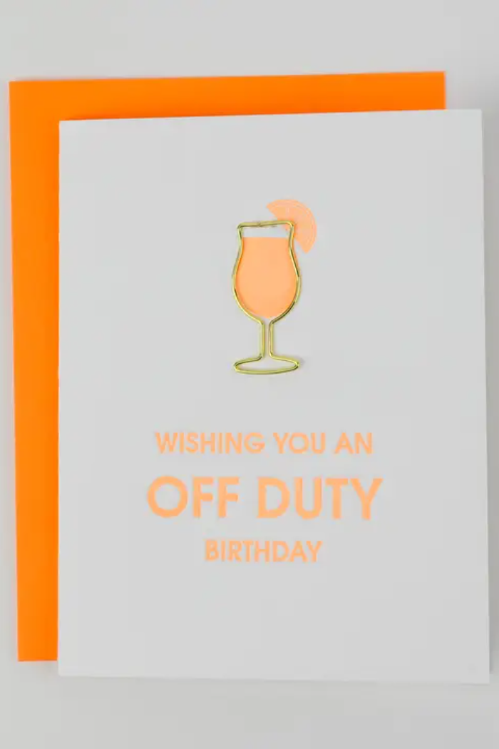 Our “Wishing You An Off Duty Birthday” card is letterpress printed on a vintage printing press in sunny California. Featuring luxe foil details and paired with a bold cosmic orange envelope, this celebratory card includes a reusable gold daiquiri glass paper clip—perfect for holding cash, a gift card, or saving as a keepsake.