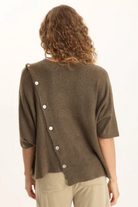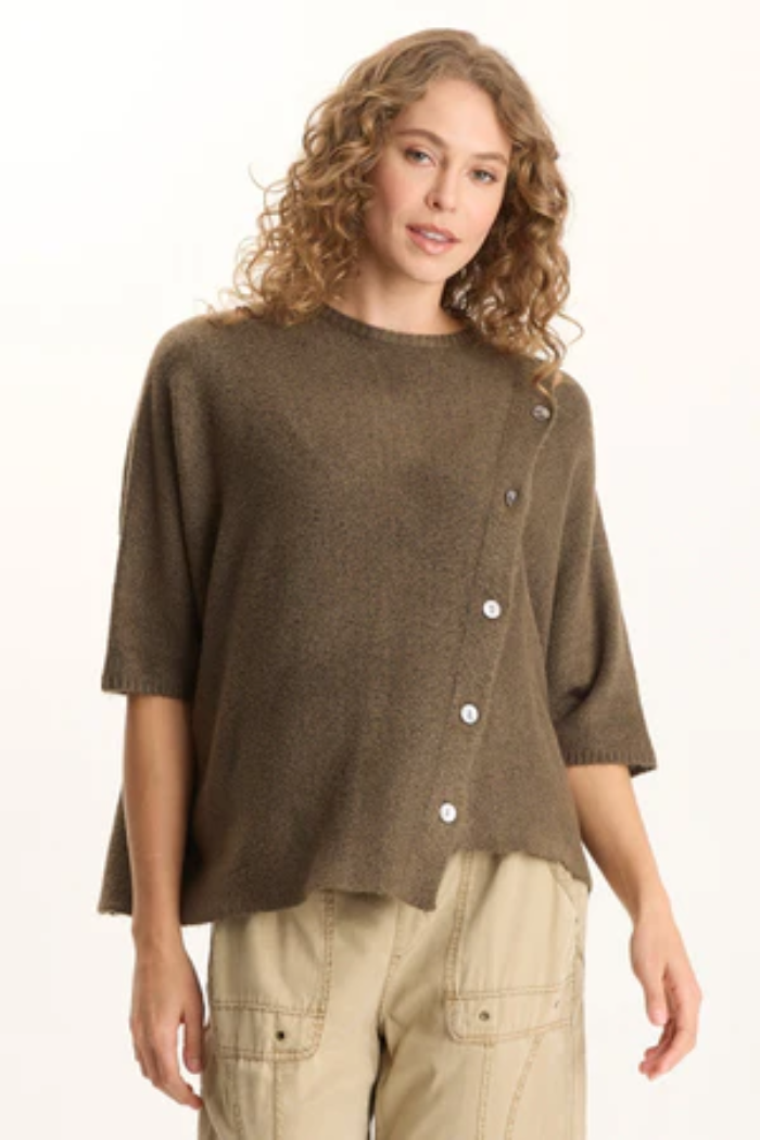 Diagonal buttons create a unique layered look with this poncho worn as a top slightly off the shoulder. Mid-length sleeves and our soft Mirelli Knit make Osiris a go-to for layering.