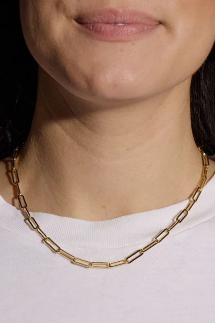 Our Paper Clip Chain Necklace is offered in gold or rhodium. Wear it alone for minimalism or attach one of our stone, heart, or pearl charms for a customized look.