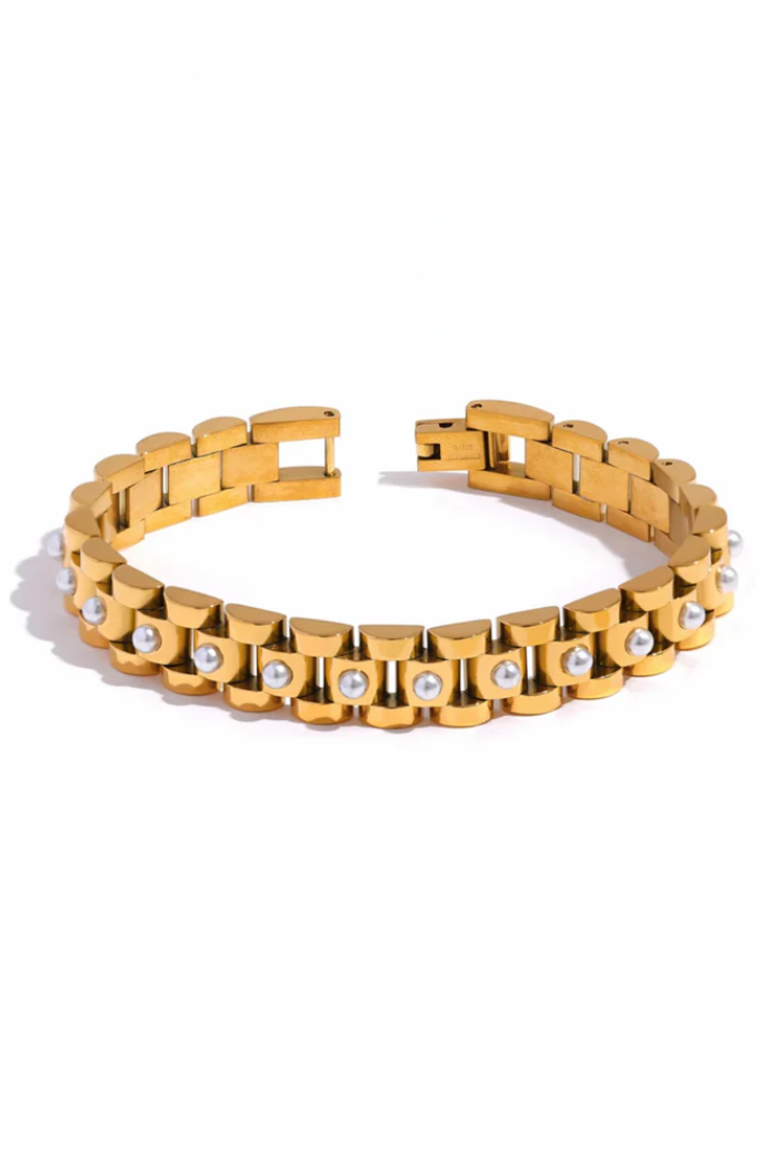 * Elegant watch-band style links accented with lustrous white pearls