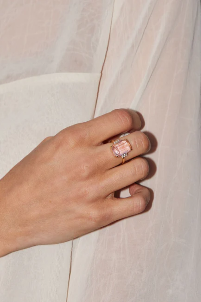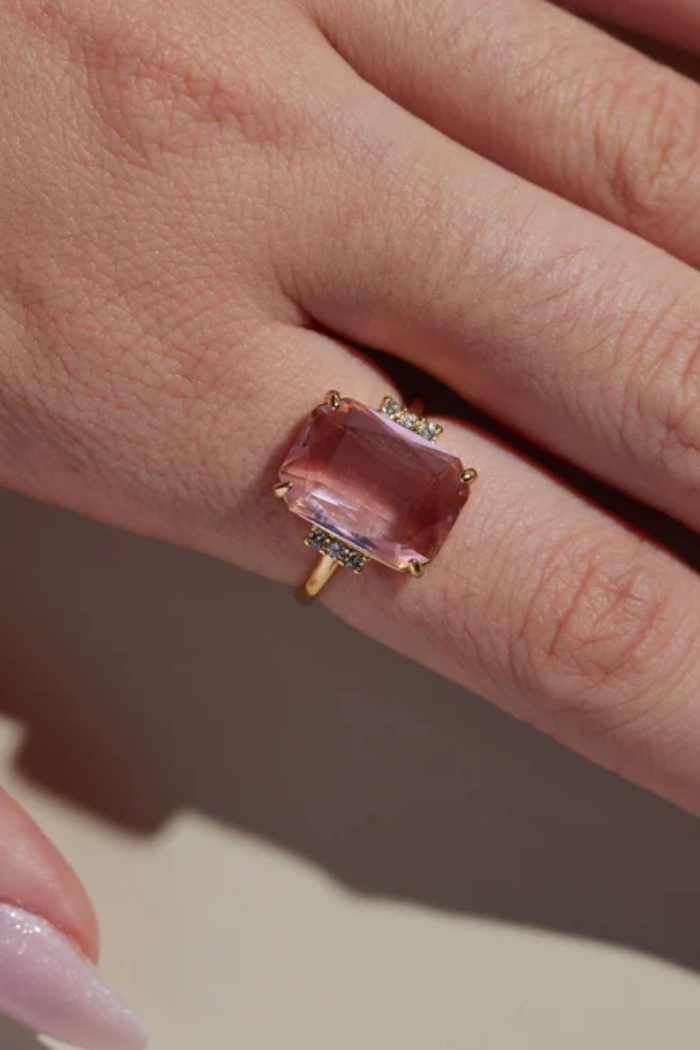 This stunning gold ring features a pink cut genuine glass stone at its center. This luxe design is elegantly crafted from 14k gold plating over plated brass.