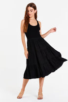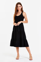 Portia rib tank midi dress with multi-tiered skirt contrast finished sleeveless with neck and armhole bias. Solid color knit on standard fit. Ever the delight, perfect aesthetic to life's leisurely pursuits! Machine wash cold, Tumble dry low Imported The ribbed bodice hugs your curves while providing all-day comfort in detailed measurements: Body length from HPS: 43", Sleeve length: N/A, Bust: 30" (Size Small) A unique design that effortlessly transitions from casual outings to chic evenings, making this the ultimate piece in comfortable clothing for women.