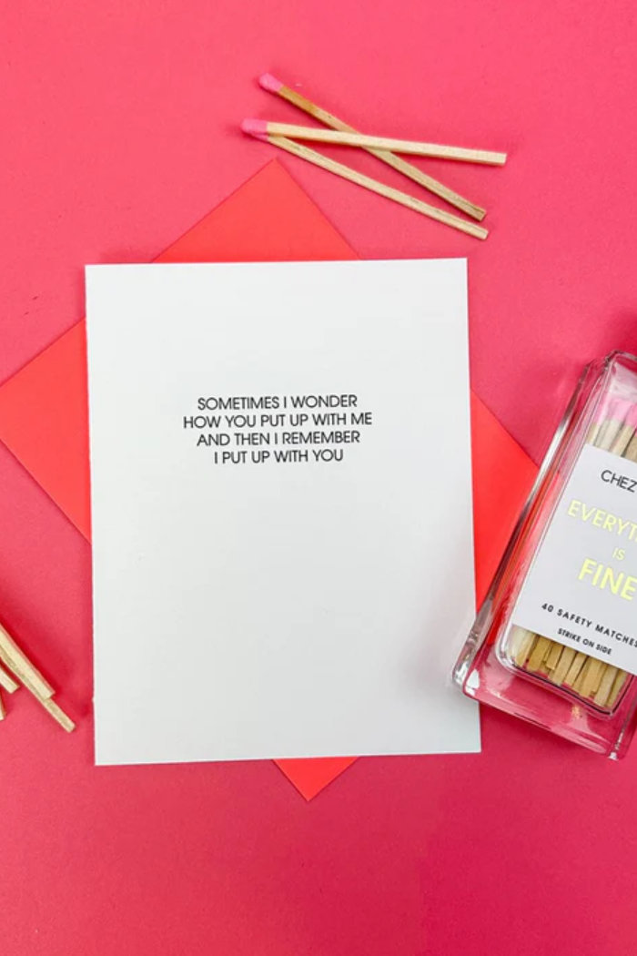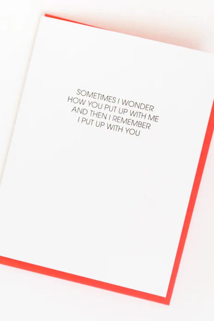 Our "Put Up With Me" card is letterpress printed on a vintage printing press in sunny California.