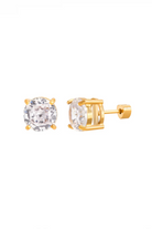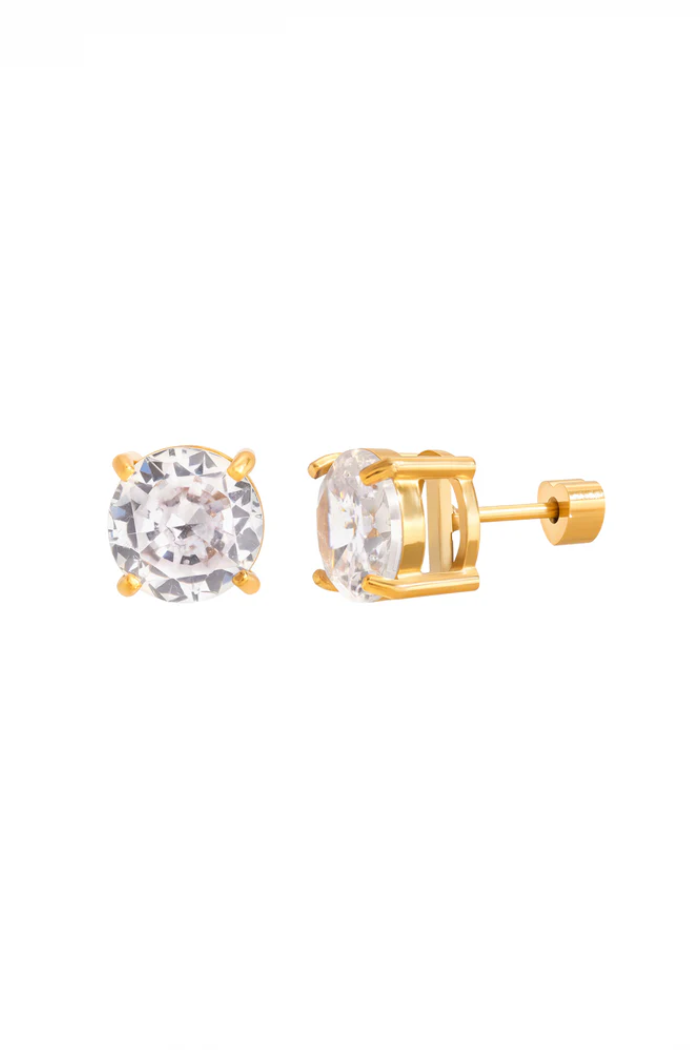 Delicate round stud earrings with a secure screwback closure, perfect for everyday wear or special occasions. The Rachel Screwback Studs Circle feature clear round-cut stones set in a gold-tone prong setting, offering classic sparkle. HJANE presents this understated pair as a timeless, easy-to-wear jewelry staple that layers beautifully with other pieces.