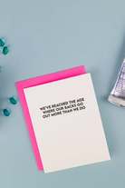Our “We’ve Reached the Age Where Our Backs Go Out More Than We Do” card is painfully relatable in the funniest way. Letterpress printed on a vintage press in sunny California, this crisp white card is paired with a bold neon pink envelope - perfect for celebrating another year of laughing, creaking, and pretending we definitely did not pull something getting out of the car.