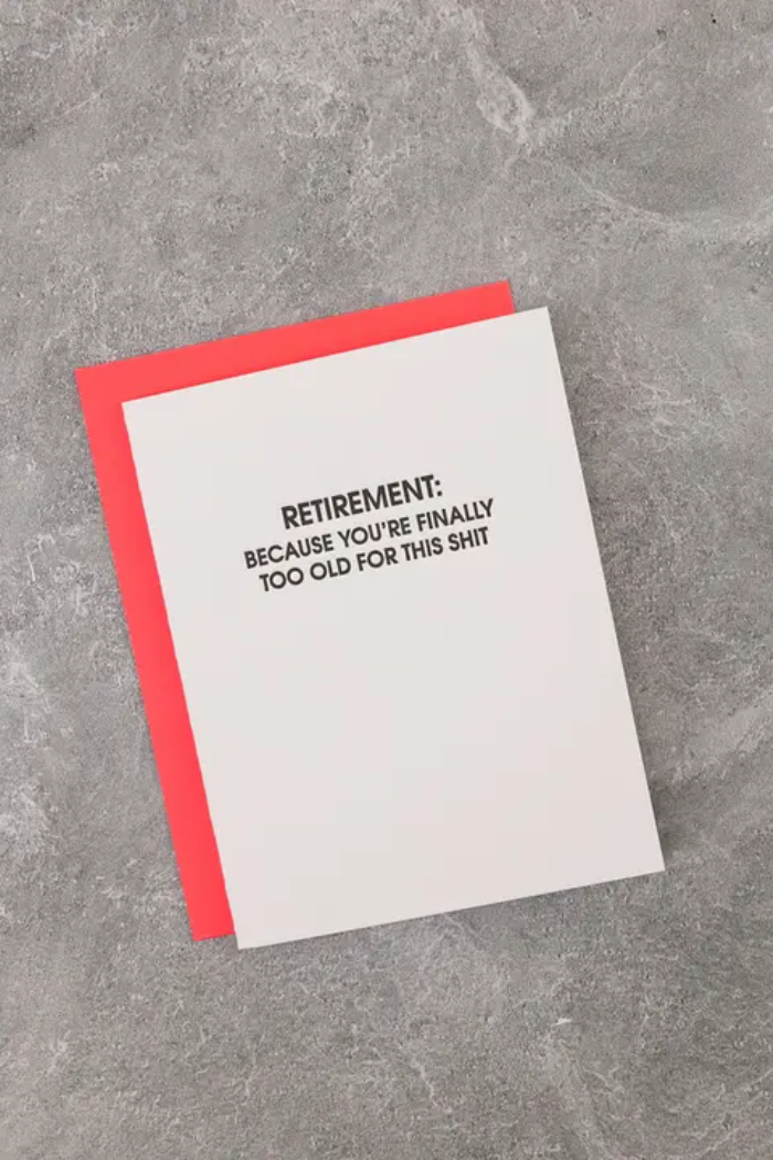 Our “Retirement: Because You’re Finally Too Old for This Shit.” card is letterpress printed on a vintage printing press in sunny California. Featuring crisp black ink on bright white paper and paired with a bold rocket red envelope, this cheeky retirement card is the perfect send-off into their next chapter.