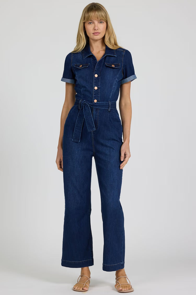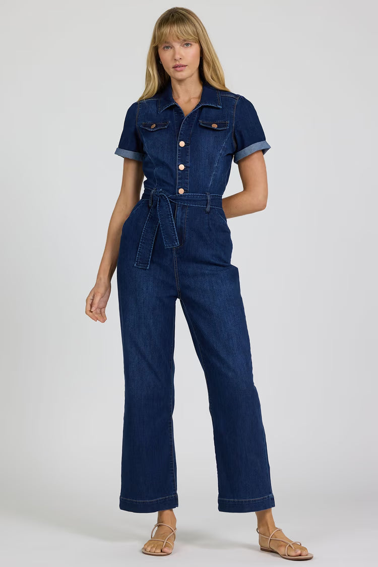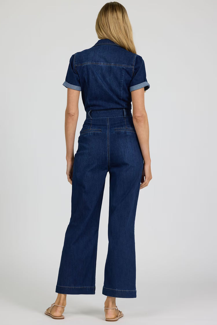 Crafted in a trendy dark wash, this fashionable one-piece suit boasts a cropped, slim fit that embodies a boho style, making it an ideal choice for a comfortable summer jumpsuit.