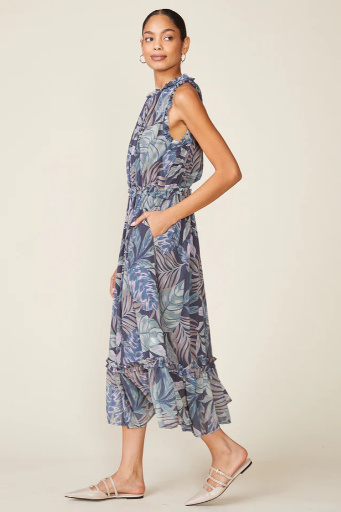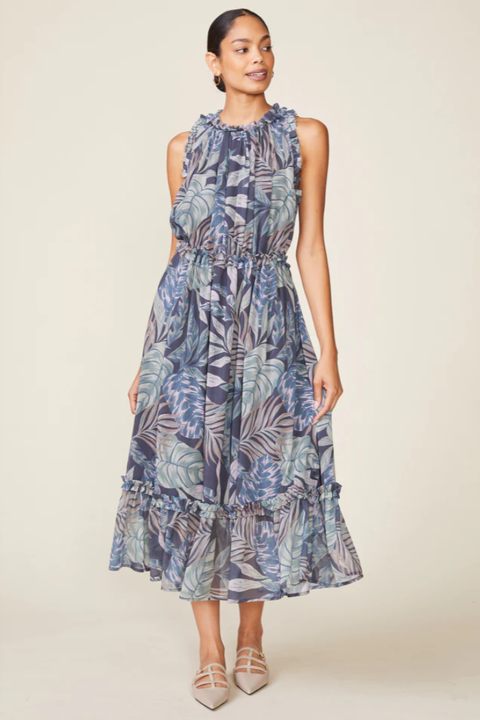 This stunning tropical print chiffon dress in moody shades of blue is flowy and flawless. Mini ruffle details throughout, a gathered bodice, flounce hem and of course pockets make this a one and done midi dress just the right amount of extra.