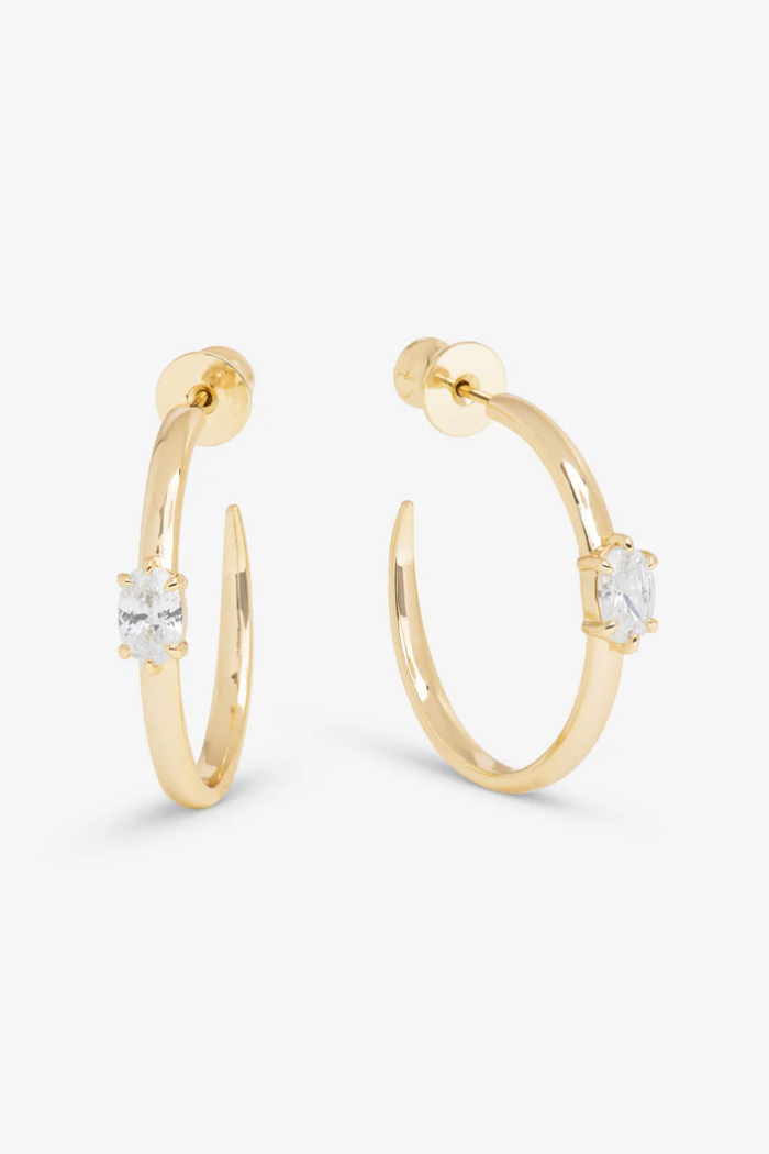 A modern take on a classic hoop. Sculpted with an oval solitaire and finished with a subtle pointed tip at the curve, this 1” silhouette balances softness with edge. Clean, polished, and designed for everyday wear.