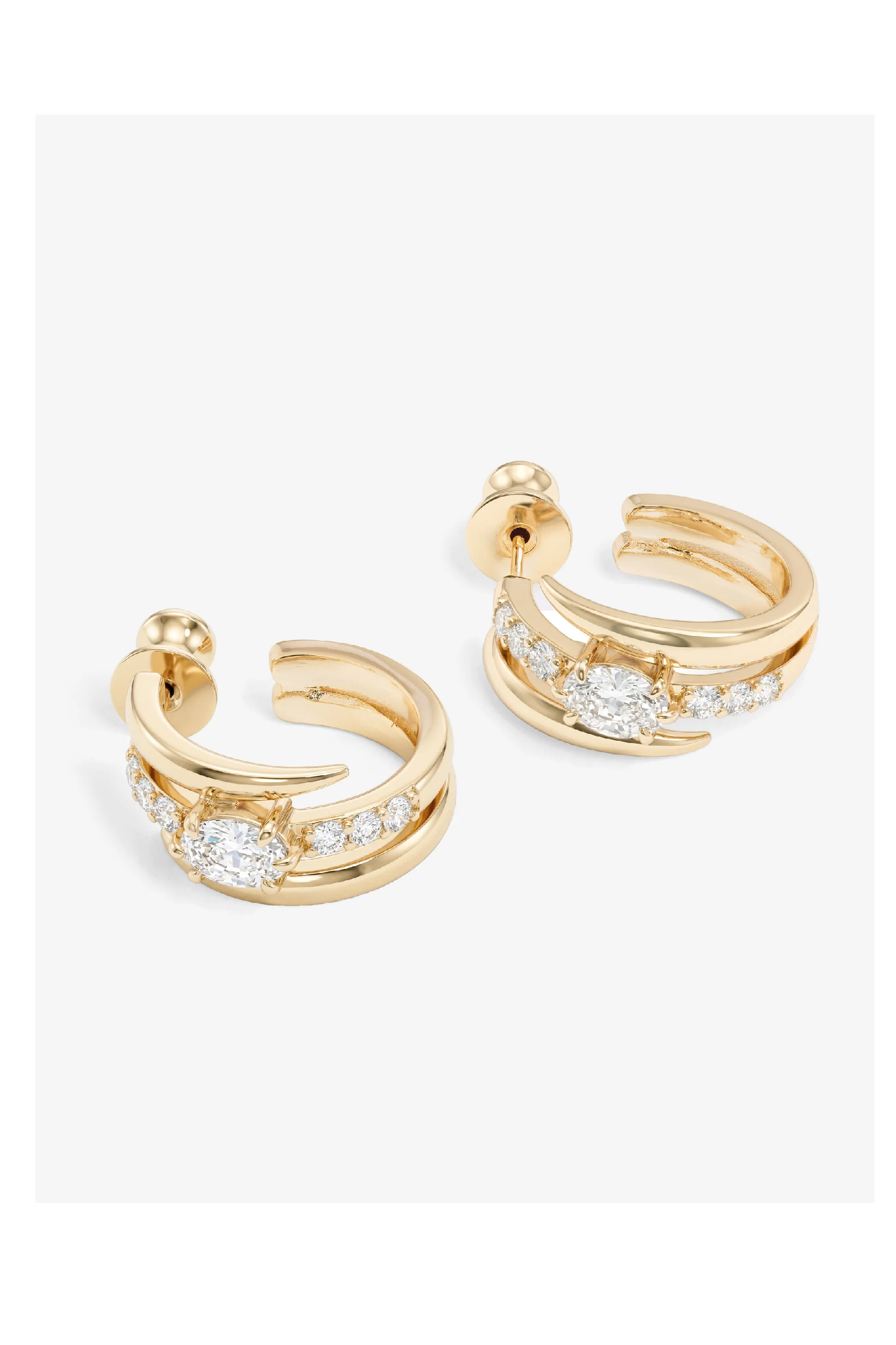 Designed to hug with impact. A sculptural lasso wrap curves around the ear, anchored by an oval solitaire that catches the light with every turn. Layered, dimensional, and finished with a modern edge.