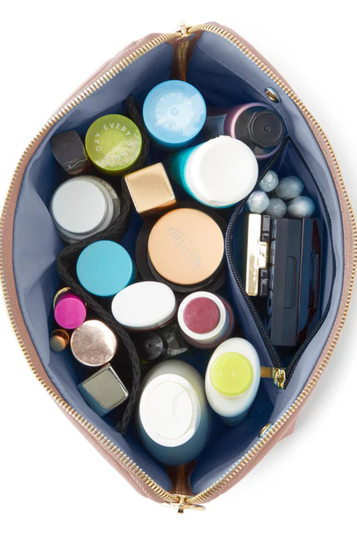 Upgrade to the makeup bag that not only stores and protects your makeup, but has pockets made for your beauty blender, eyelash curler, and more. The Signature Makeup Bag has roomy compartments and opens on three sides to allow for easy access to see all of your products. No more digging! Add a Snap-in an Organizer for more organization and separation. Fabric bags are fully machine washable. Leather bags have a zip-out interior liner that is machine washable.