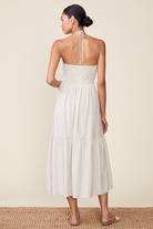 The Striped Linen Cinch Halter Maxi Dress is an effortless warm-weather staple designed for easy, breezy style. Made from lightweight striped linen, it features a flattering ruched cinch bodice with a halter tie neckline that highlights the shoulders while offering an adjustable fit. The tiered maxi skirt drapes beautifully and moves with you, creating a relaxed, flowy silhouette that feels both comfortable and feminine. Designed by Anthem the Label, this sleeveless dress captures a laid-back, boho feel that’s perfect for sunny days, vacations, and weekend outings.