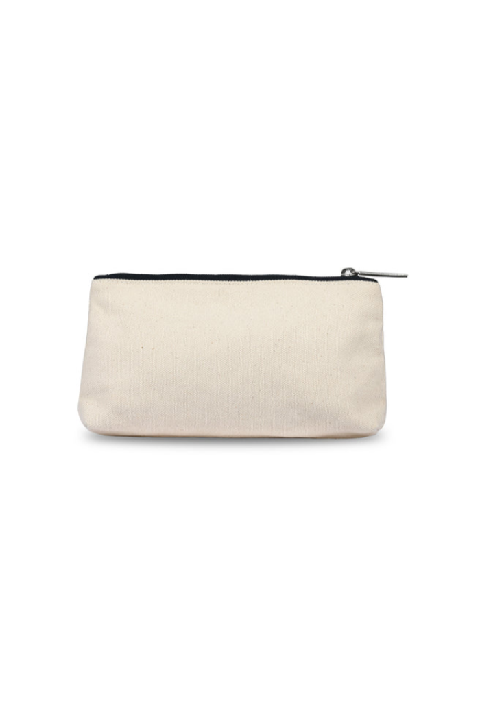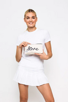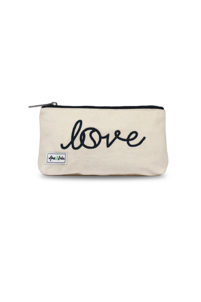 A compact cosmetic pouch with a playful "love" script and top zipper closure, ideal for organizing makeup and small essentials. The Tennis Love Cosmetic Bag is rendered in a natural canvas fabric with a contrasting zipper trim for a casual, lived-in look. Blue Gardenia designed this piece to slide into a tote or suitcase for everyday errands and weekend getaways.