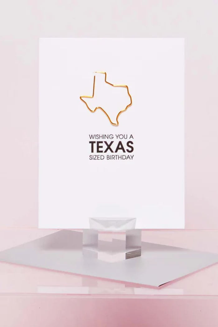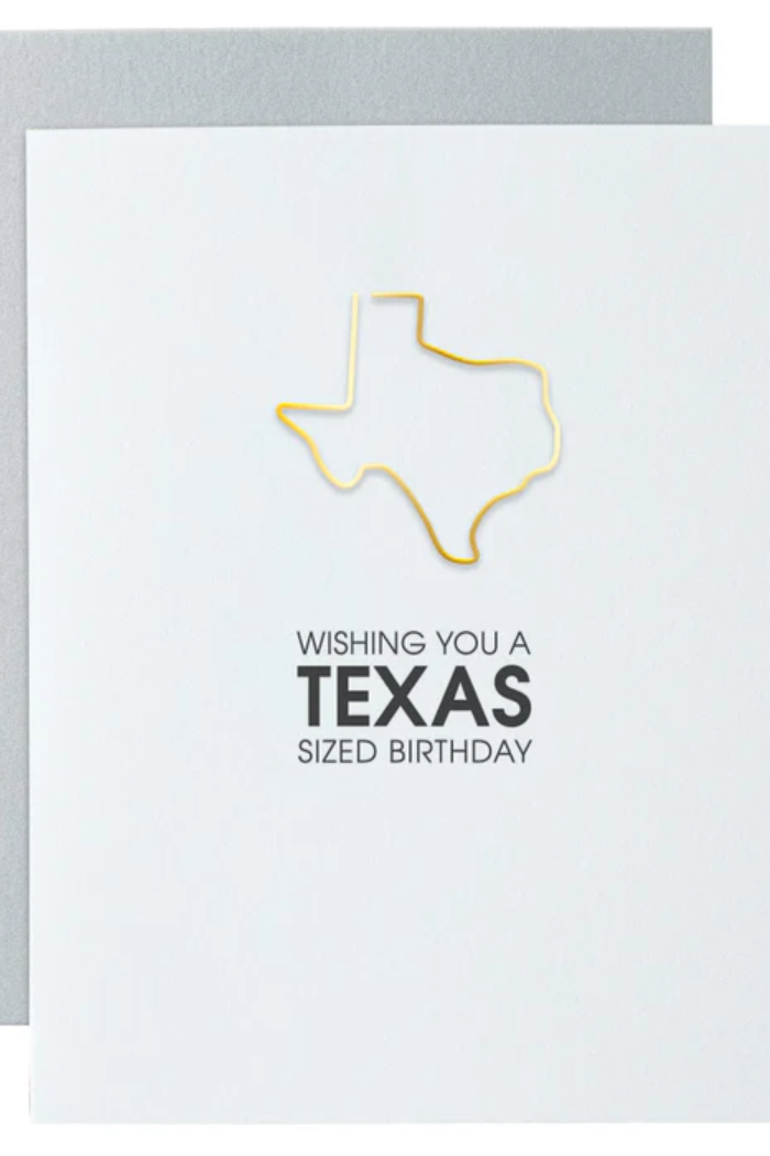 Our "Wishing You a Texas Sized Birthday" card is letterpress printed on a vintage printing press in sunny California. Card includes a heavy duty Texas paper clip.