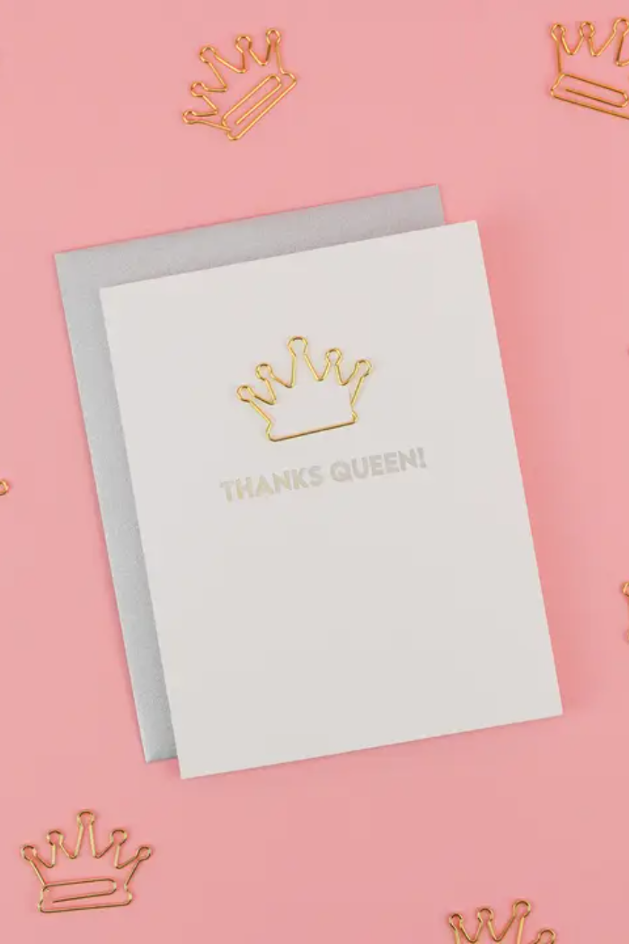 A thank-you card fit for royalty. This chic, modern design pairs a gold crown paperclip with a clean letterpress “THANKS QUEEN!” - making it the perfect way to hype up the women who make everything happen. Whether it’s a friend, coworker, teacher, or the person who saved your entire week, this one hits every time.