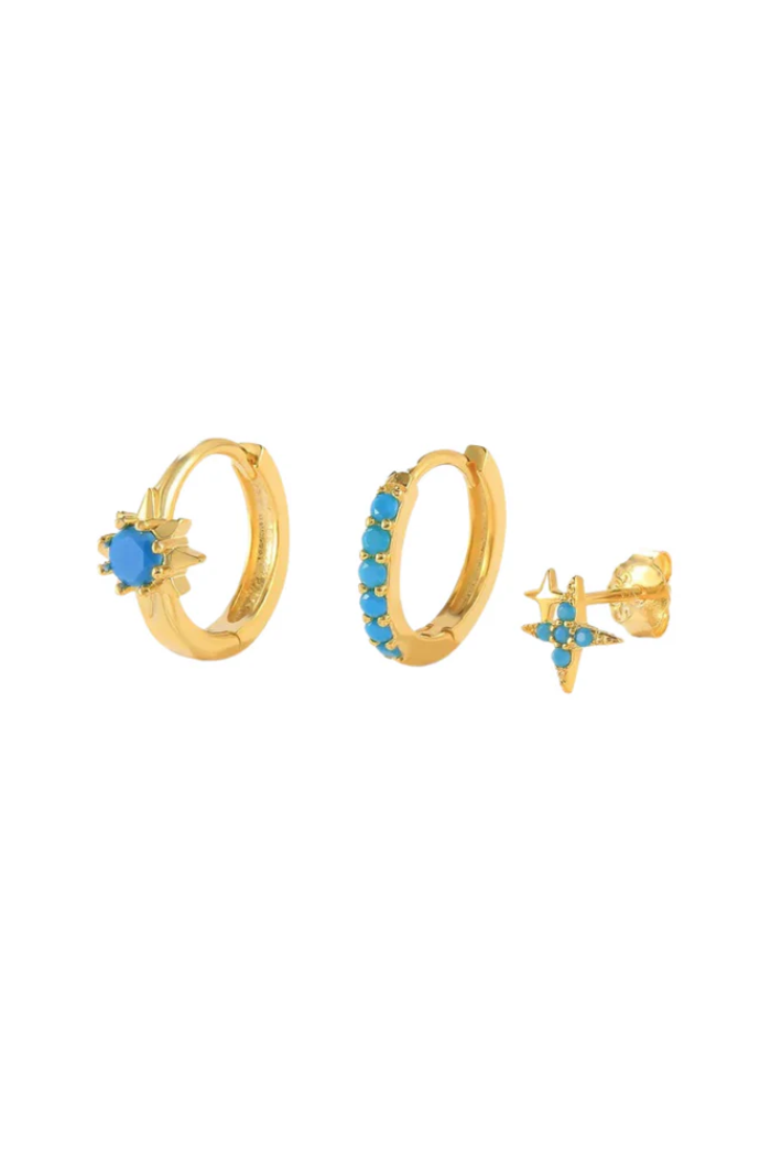 Elevate your ear game with the Turquoise Starburst Trio Set from Hjane Jewels, a celestial-inspired collection designed for modern, playful styling. This versatile set features three distinct earrings that can be worn together or mixed-and-matched for a personalized look.