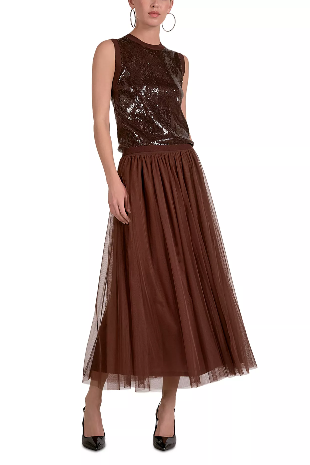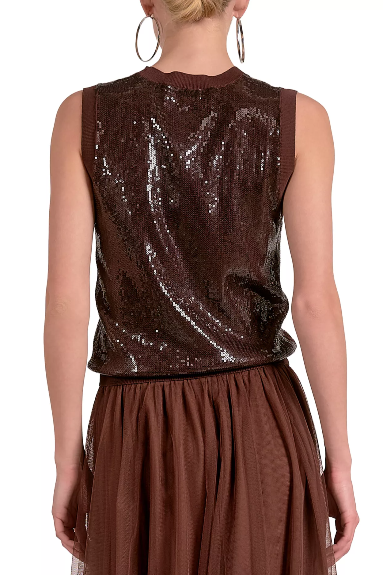 Turn heads from sunrise to soirée with the Vera Top by Elan. This high-neck tank sweater is drenched in refined sequins that shimmer with every step, giving you the perfect balance of cozy comfort and eye-catching style. Its sleek, sleeveless silhouette layers effortlessly under blazers or shines on its own, making it a versatile piece for both daytime polish and evening glam. Slip it on when you want your outfit to feel effortlessly elevated, and undeniably radiant.